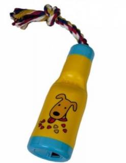 A garrafa AZPR é produzida com plástico não tóxico, corda e possui uma abertura regulável em sua base para a liberação de ração.